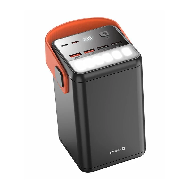 Swissten Power Line 60 000 mAh wyposażony został w kilka portów wyjściowych – USB-C, USB-A oraz DC – dzięki czemu z łatwością naładujesz równocześnie wiele urządzeń. Inteligentny system rozdziału mocy automatycznie dopasowuje parametry ładowania do każdego z podłączonych sprzętów, chroniąc je przed przegrzaniem, przeciążeniem i przepięciami.