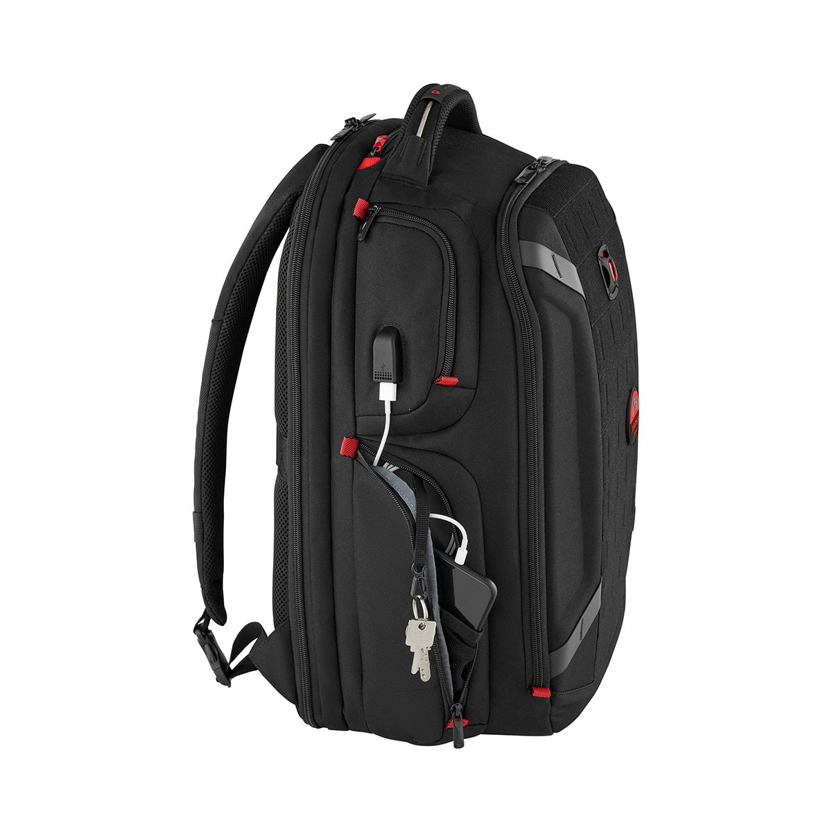 - jedna z zewnętrznych kieszeni wyposażona w zewnętrzny port USB do ładowania,