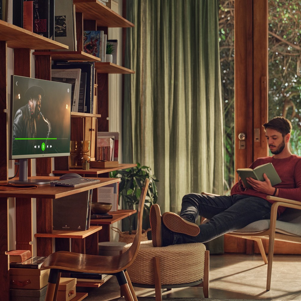 Koncepcja wszystko w jednym zmniejsza liczbę urządzeń i kabli na biurku, co sprzyja porządkowi i estetyce domowego biura. Ekran 27 cali z wąskimi ramkami daje dużą przestrzeń roboczą bez rozpraszających dodatków - świetne do przeglądania dokumentów i jednoczesnego prowadzenia rozmów. To może być np. centrum rodzinnego użytku: dzieci oglądają treści, rodzic pracuje, a wszyscy korzystają z jednego eleganckiego sprzętu. Dodatkowo konstrukcja zawiera elementy z recyklingu, co zmniejsza wpływ na środowisko. Dzięki temu masz schludne, funkcjonalne miejsce pracy i rozrywki.