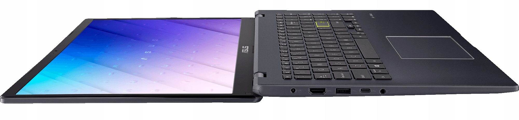 ASUS L510 ma młodzieńczy klimat, który go wyróżnia. Pokrywa jest wykończona nowoczesnymi nacięciami, którym towarzyszy unikalny motyw złożony z rozłożonej odznaki ASUS. Odważny wygląd jest kontynuowany w środku, gdzie jasnożółty Enterkey zajmuje centralne miejsce. To coś, czego nigdy wcześniej nie widziano w projektowaniu laptopów.