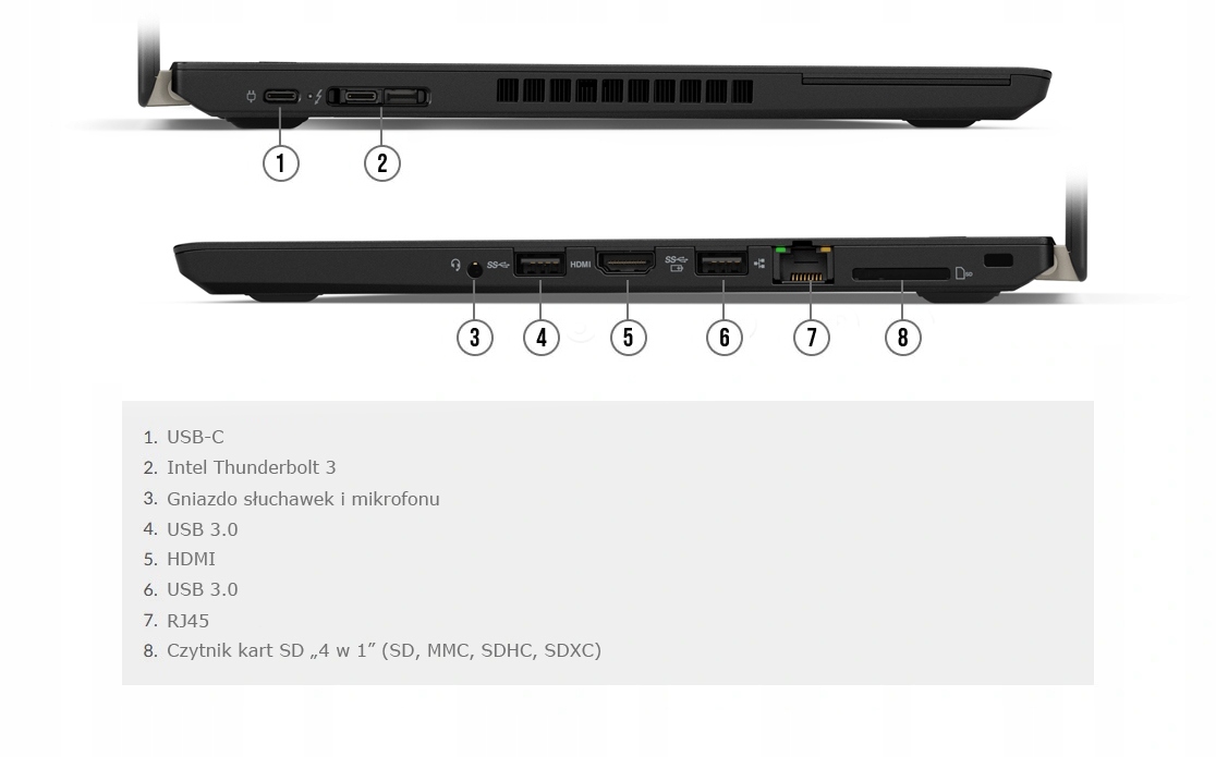 ThinkPad T480 w standardowej konfiguracji jest wyposażony w ThinkShutter — fizyczną osłonę kamery internetowej. Zgodnie z oczekiwaniami użytkowników ThinkPadów najnowszy model z serii T ma złącze dokowania USB-C z boku, a nie na spodzie. Dzięki temu T480 może mieć zaledwie 19,95 mm grubości. Jest także wyposażony w różne inne przydatne gniazda, takie jak błyskawiczny Intel® Thunderbolt™ 3. Pracę w drodze lub przy słabym oświetleniu ułatwia dodatkowo słynna ergonomiczna klawiatura ThinkPad z wygodnym trackpointem.