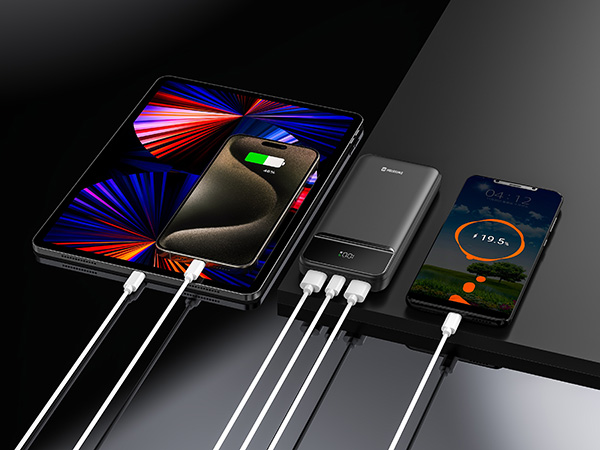Powerbank Swissten Power Line II został wyposażony w port USB-C (dwukierunkowy – wejście/wyjście) oraz dwa złącza USB-A, co pozwala na jednoczesne ładowanie nawet trzech urządzeń. Dzięki inteligentnemu układowi zarządzania energią powerbank automatycznie rozpoznaje podłączone urządzenie i dostosowuje parametry ładowania, zapewniając maksymalną efektywność i bezpieczeństwo.